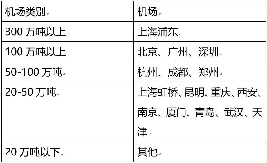 2019年貨郵吞吐量在20萬噸以上的共16個機(jī)場,吞吐量之和占全國總量的80%,是國家航空貨運(yùn)發(fā)展的未來所在建設項目。各地機(jī)場按貨郵吞吐量大小可分為五類最為突出,如下表示: